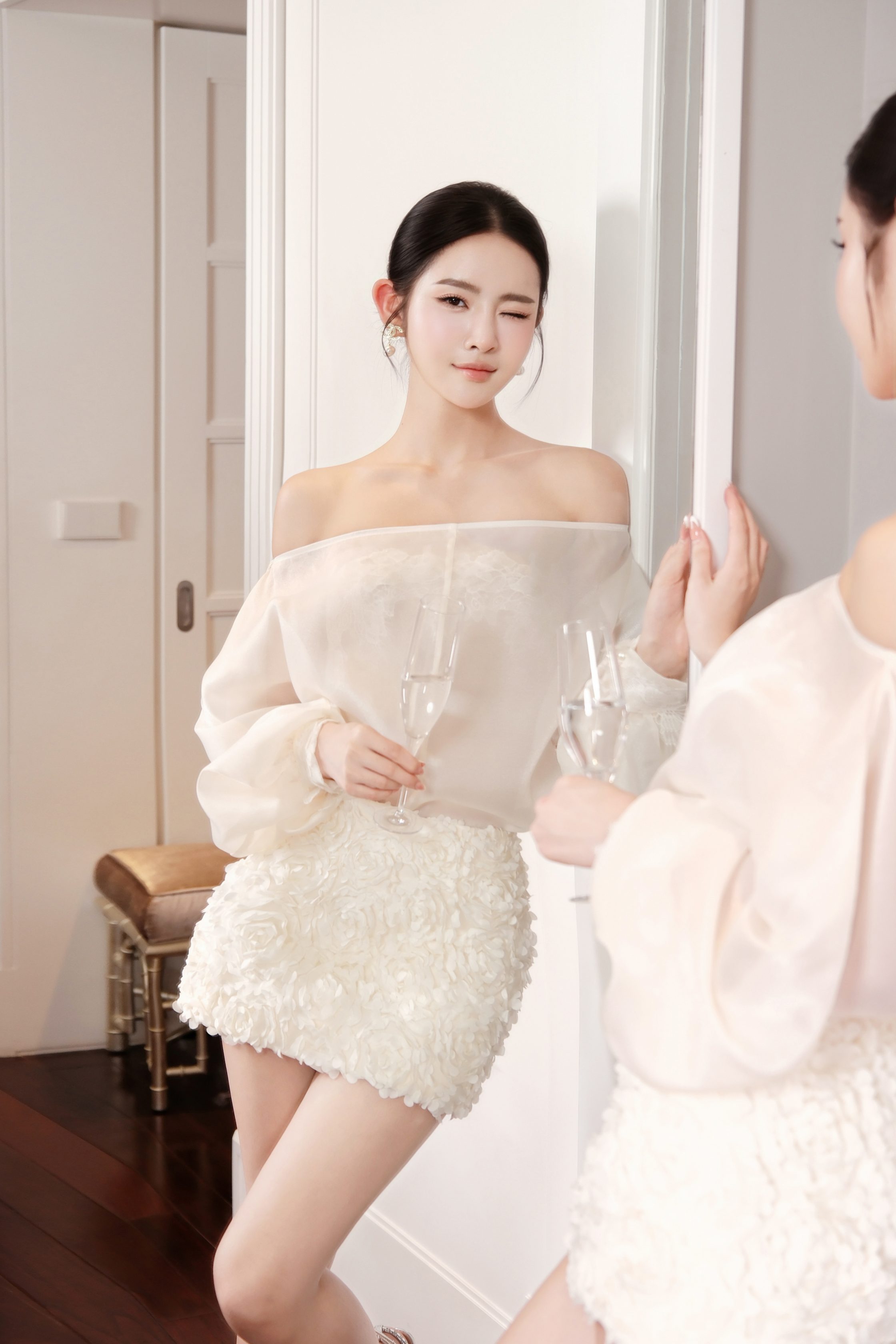 Phần áo trễ vai làm từ chất liệu tơ ánh kim cao cấp, tay dài phồng nhẹ tạo nét tiểu thư kiêu kỳ. Chi tiết cổ tay đính ren bướm 3D và nút ngọc trai sau lưng là điểm nhấn độc đáo, sang trọng. Bên trong là áo ống lưới màu da phối ren trắng – vừa kín đáo vừa gợi cảm, có khoá kéo dễ mặc.