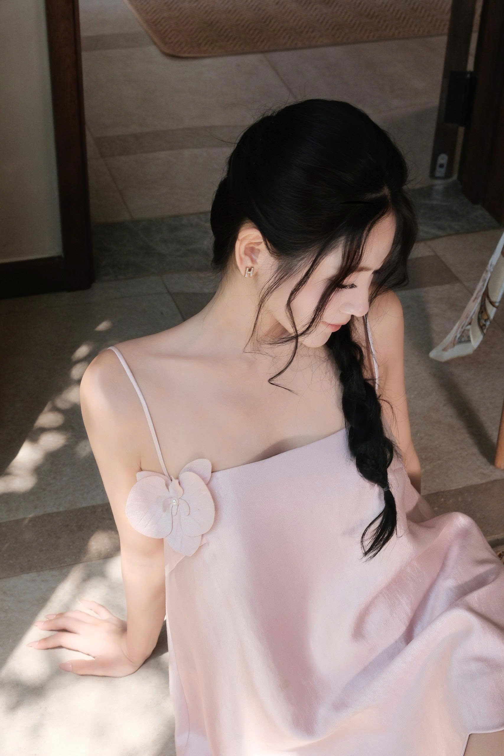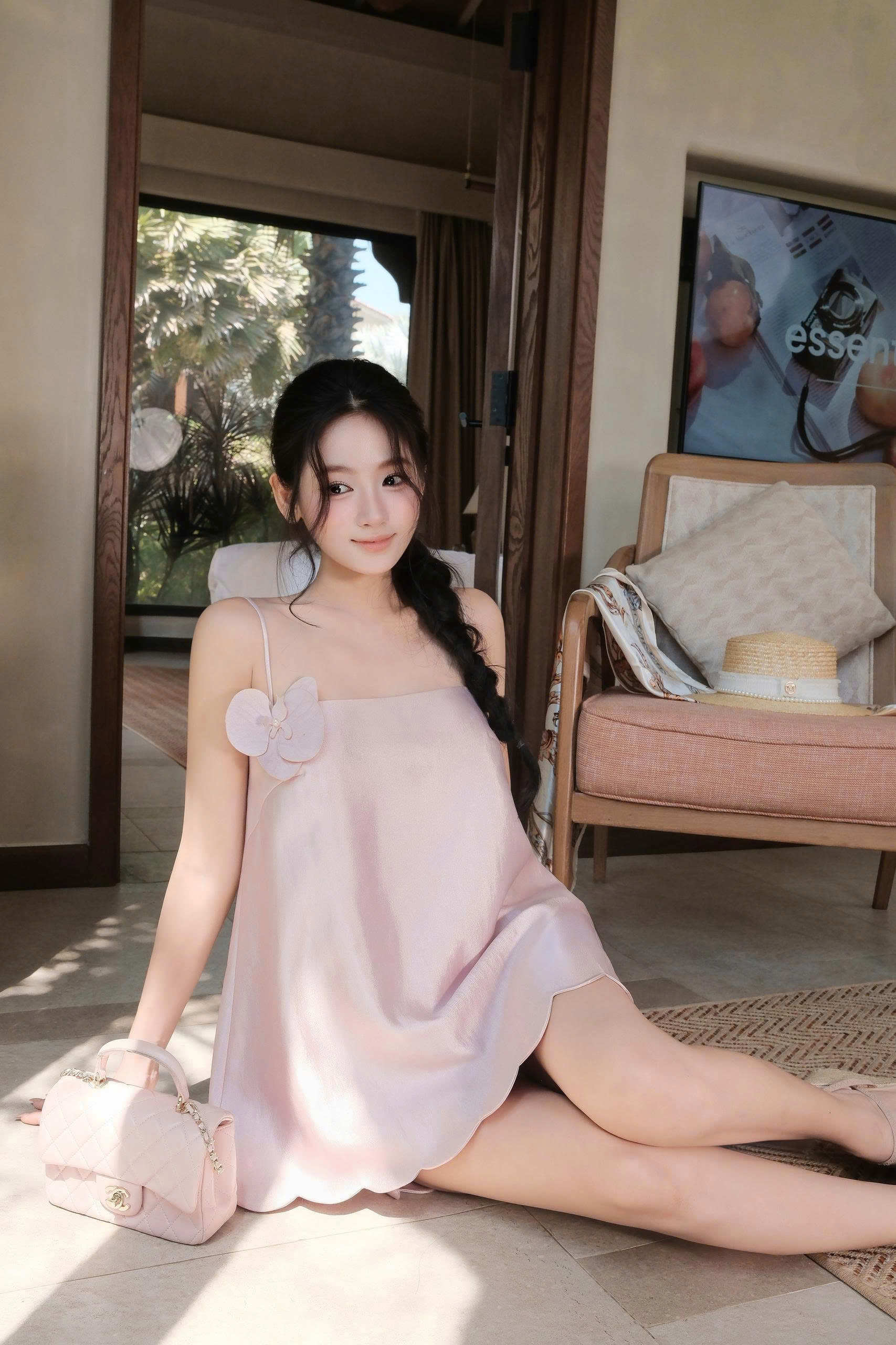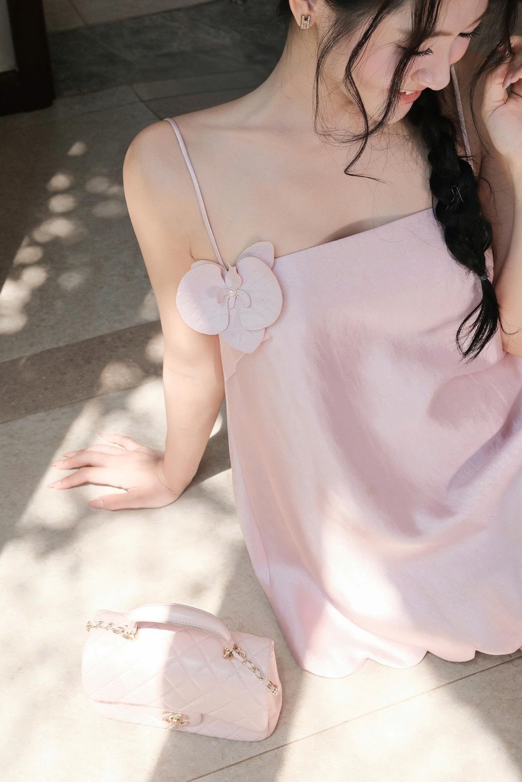 Điểm nhấn hoa vải đính lệch cùng gấu váy lượn sóng giúp tổng thể thêm nữ tính và bay bổng. Chất liệu tafta ánh hồng đứng form nhẹ, bắt sáng tinh tế, giúp outfit nổi bật nhưng vẫn thanh lịch.