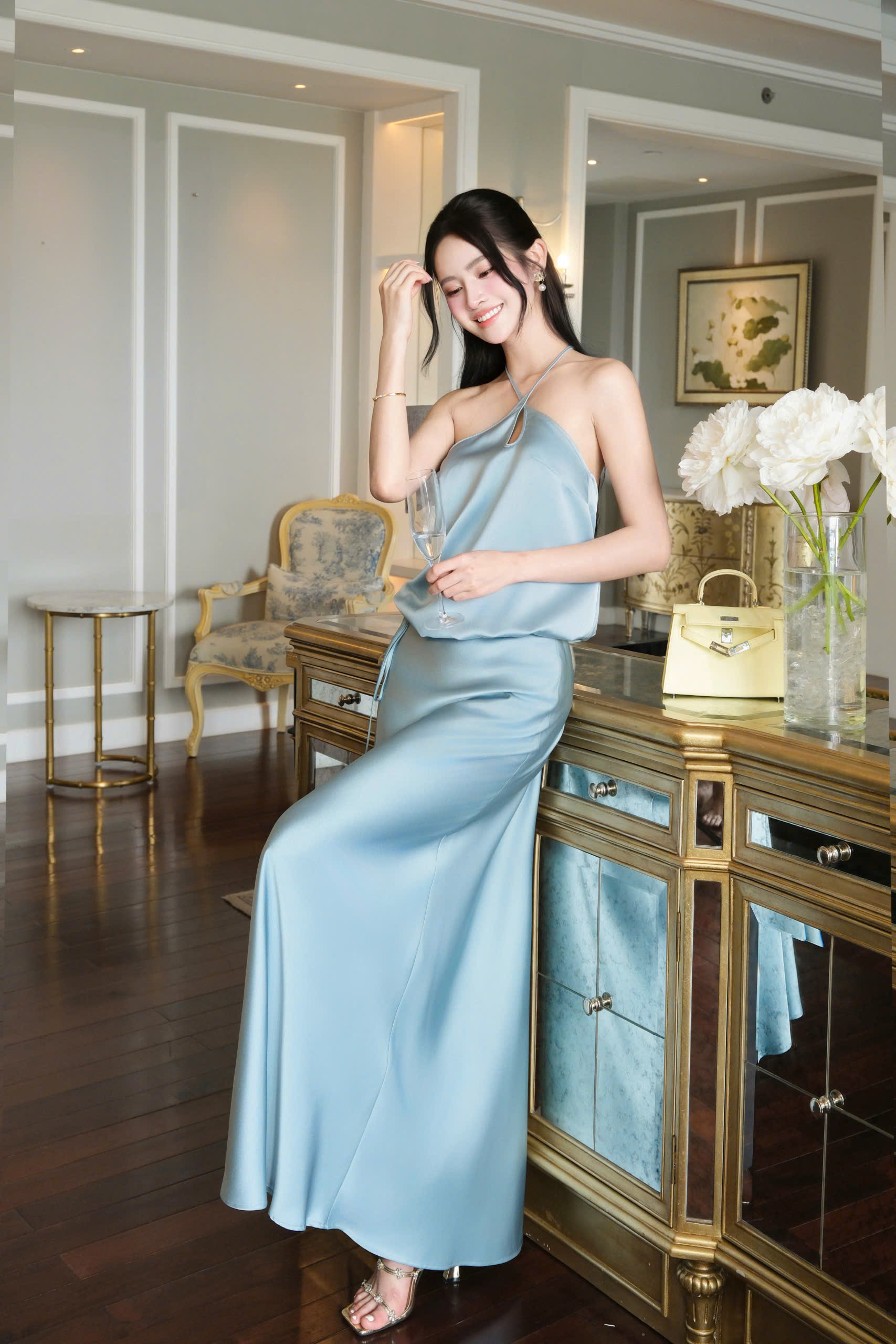 KS228 là set đồ 2 món cực kỳ thanh lịch và quyến rũ, mang đến vẻ ngoài sang trọng và nữ tính mà vẫn thoải mái cho người mặc. Chất liệu lụa trượt xanh gi cao cấp có độ bóng nhẹ và mát da, giúp outfit lên form mềm mại, bắt sáng tốt trong các khung hình tiệc tối.