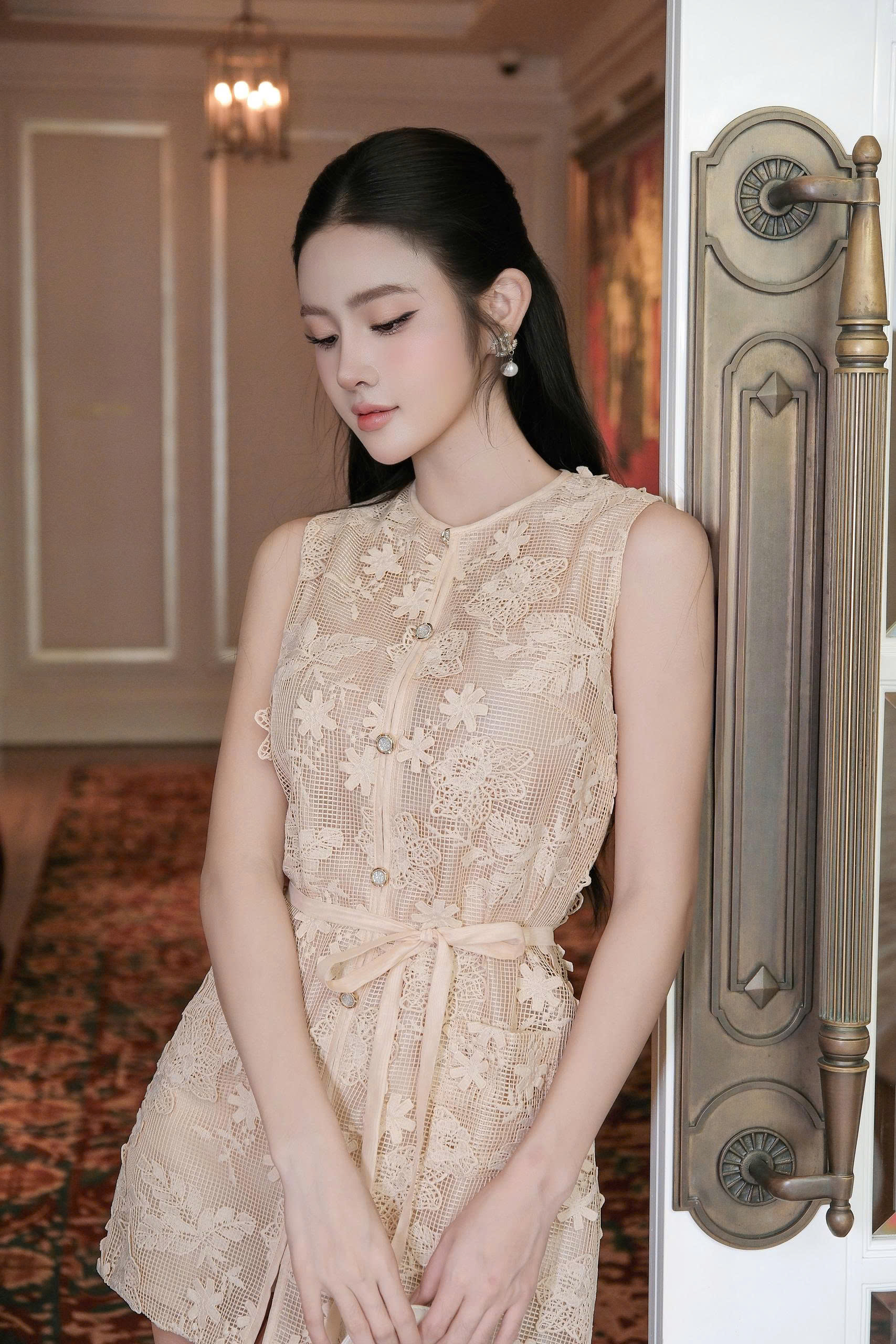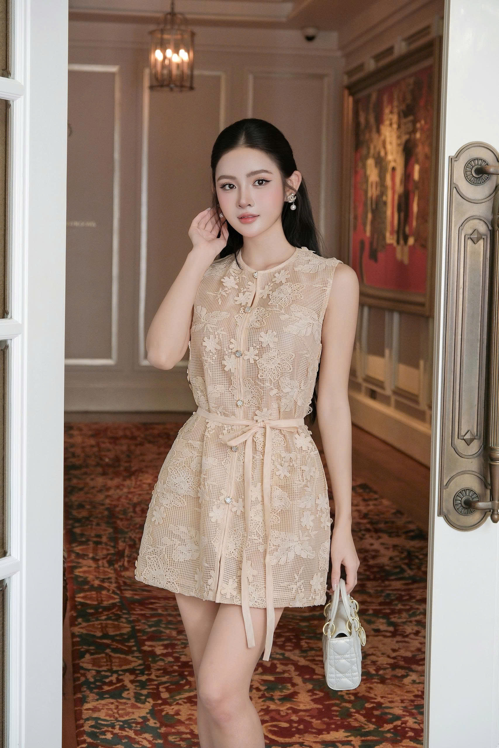 Phần váy dáng mini dress sát nách, form suông nhẹ mang lại cảm giác gọn gàng, thanh lịch mà không kén dáng. Chất liệu ren hoa thêu nổi cao cấp tạo hiệu ứng xuyên nhẹ tinh tế, giúp outfit trở nên mềm mại, nữ tính nhưng vẫn giữ được vẻ sang trọng cần thiết.
