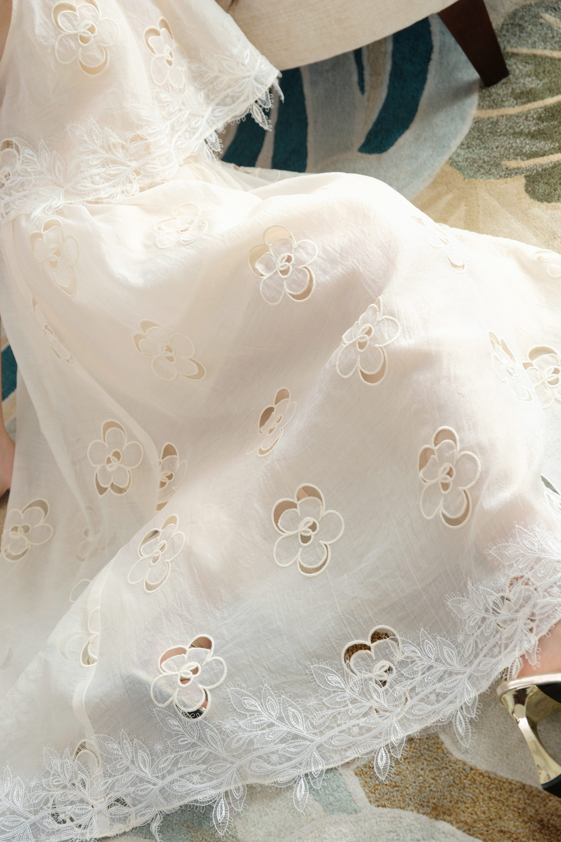 Viền ren lá trắng thêu tinh xảo ở thân áo tạo điểm nhấn duyên dáng